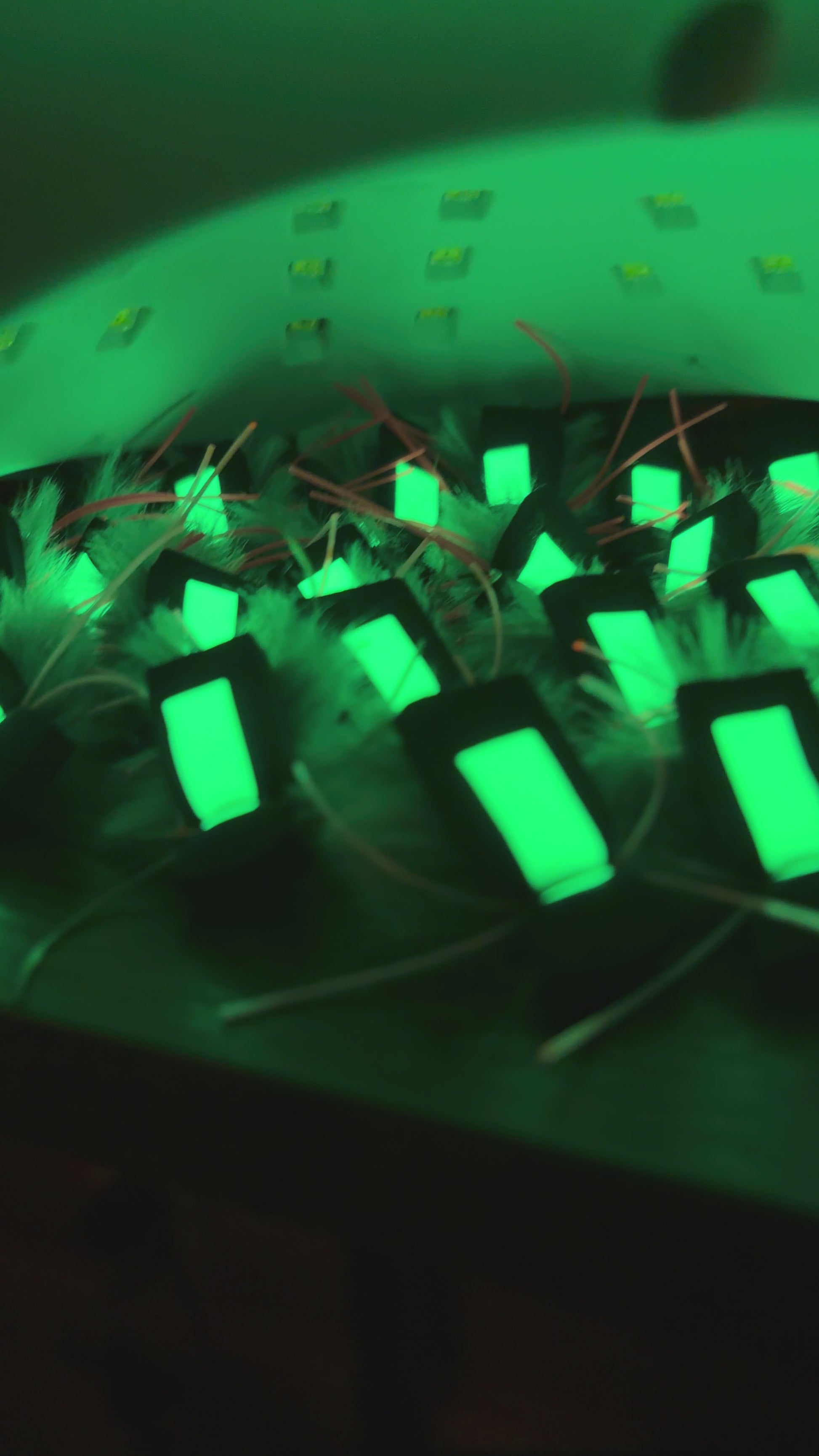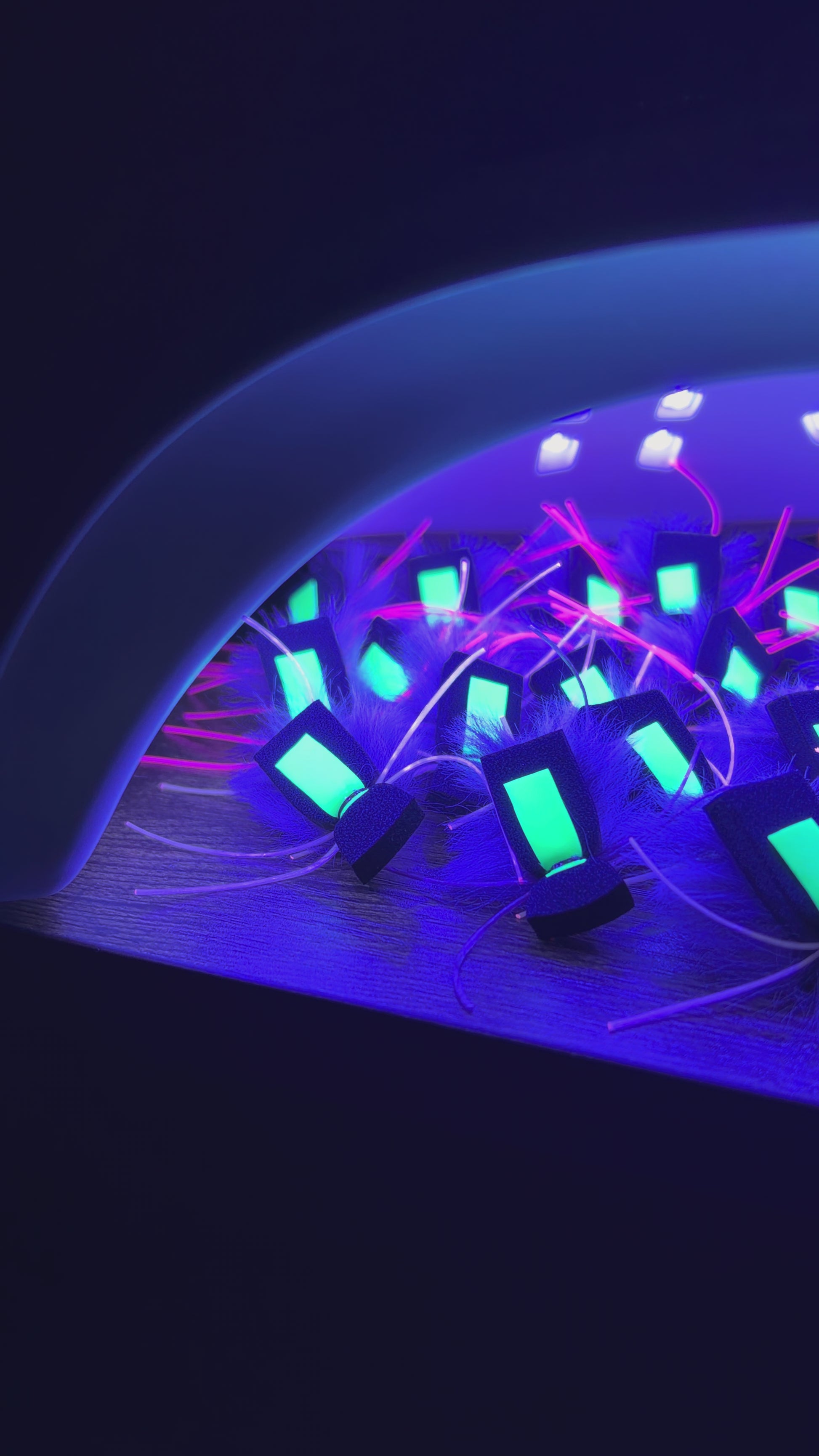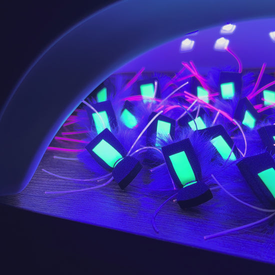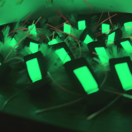 -Durability. This is the main reason why this is the mouse you should buy over other glowing mice on the market. Most glowing mice being sold to anglers use a glowing paint that is applied to a foam tab. While these flies work great and glow brightly, there is one glaring problem. Foam tabs and sharp brown trout teeth do not get along well. Using a piece of flimsy foam is a one way ticked to a destroyed fly. Oftentimes at night, trout slash at their prey, and missing fish is fairly common. Each time those mega sharp teeth touch a less-than-durable glow material, you lose visibility and decrease your chances of finding a trophy brown. My mice sometimes use the glowing paint as an addition, but they ALWAYS use a highly durable square of high glowing latex as the sighter. These glow tabs are incredibly bright, and glow for hours when charged with a UV tying light. I also use high quality glues under all of my materials, and apply resin over my thread wraps. My goal is for your flies to last you fish after fish, night after night.