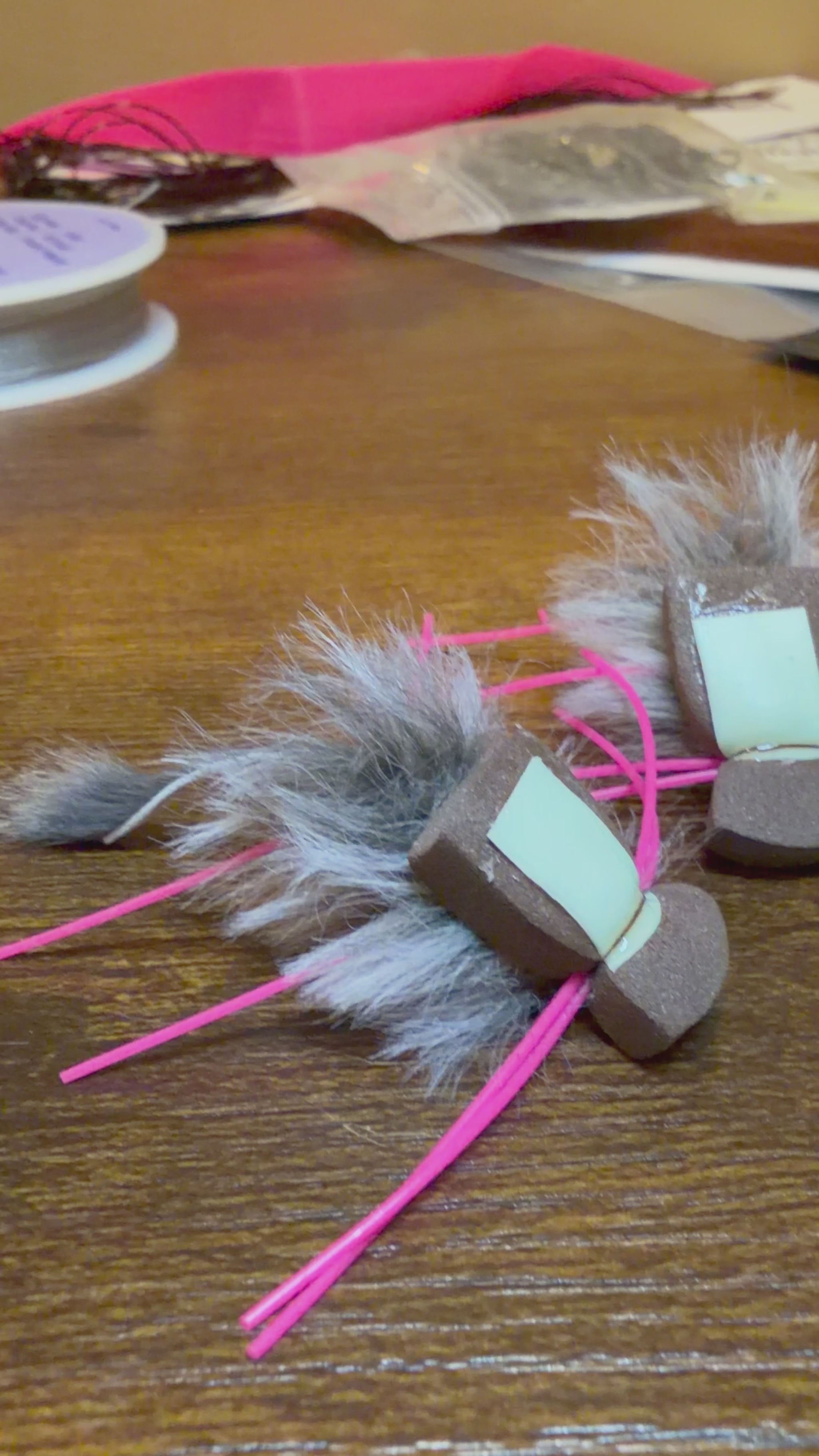 -Simplicity. I'll cut to the chase. Your mouse doesn't need a tail. It doesn't need eyes or ears or anything fancy. It needs thick foam to float, a high visibility glowing sighter, and a design that pushes water. The foam lip of my mice pushes water, and the fur beneath the foam combined with the simple legs increases the wake and water movement. Browns use their lateral line more at night, and although you certainly don't need a popper or gurgler level of "push" for your flies, you should have a wake behind them. These guys do a perfect job of that.